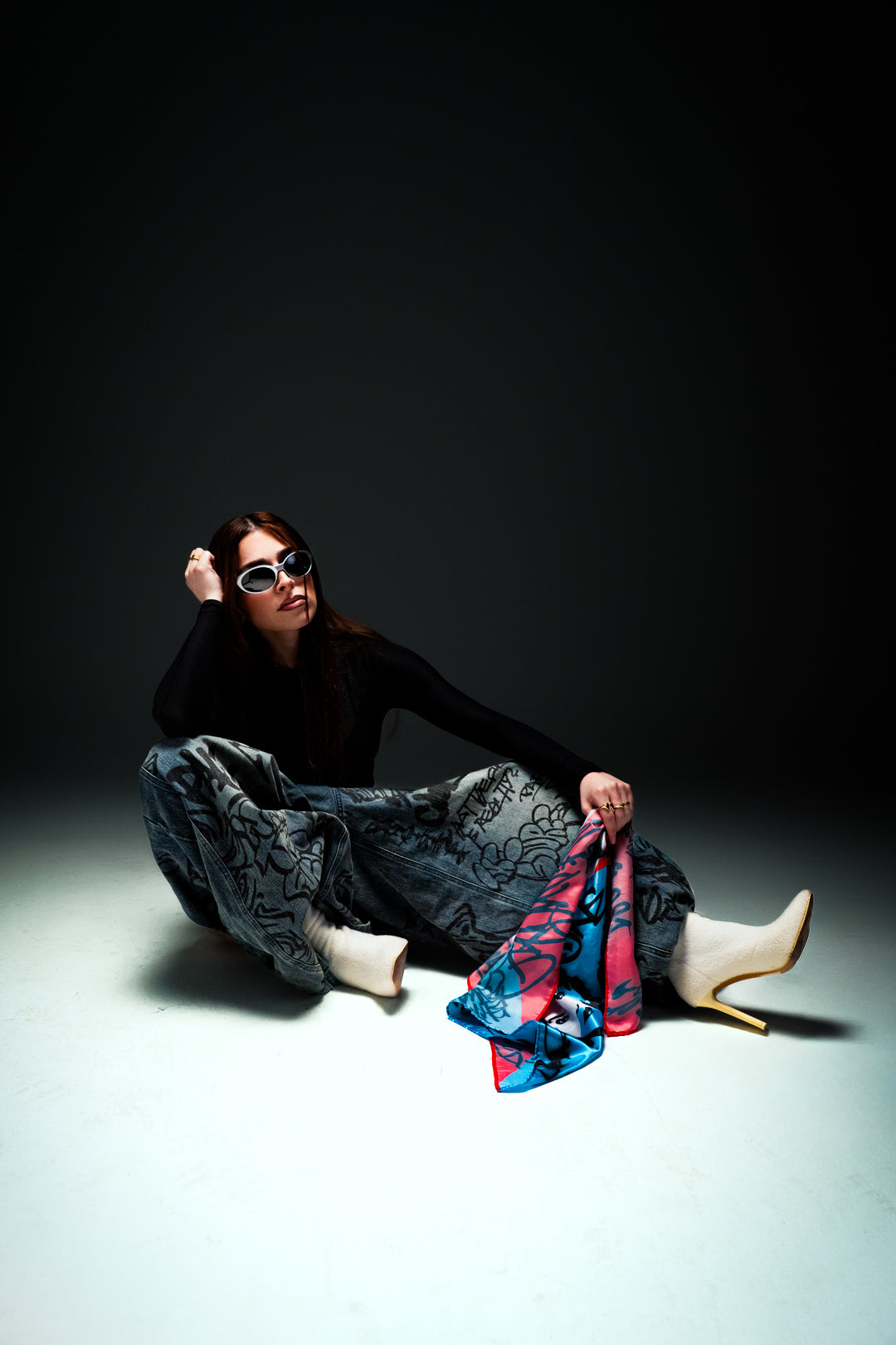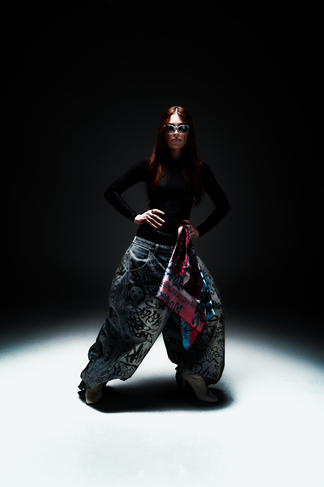 Across the legs, layered hand-style graphics emerge like markings left in the hidden alleys of a dystopian city—signals placed to disrupt, inform, and awaken. These designs function as acts of defiance rather than ornamentation.